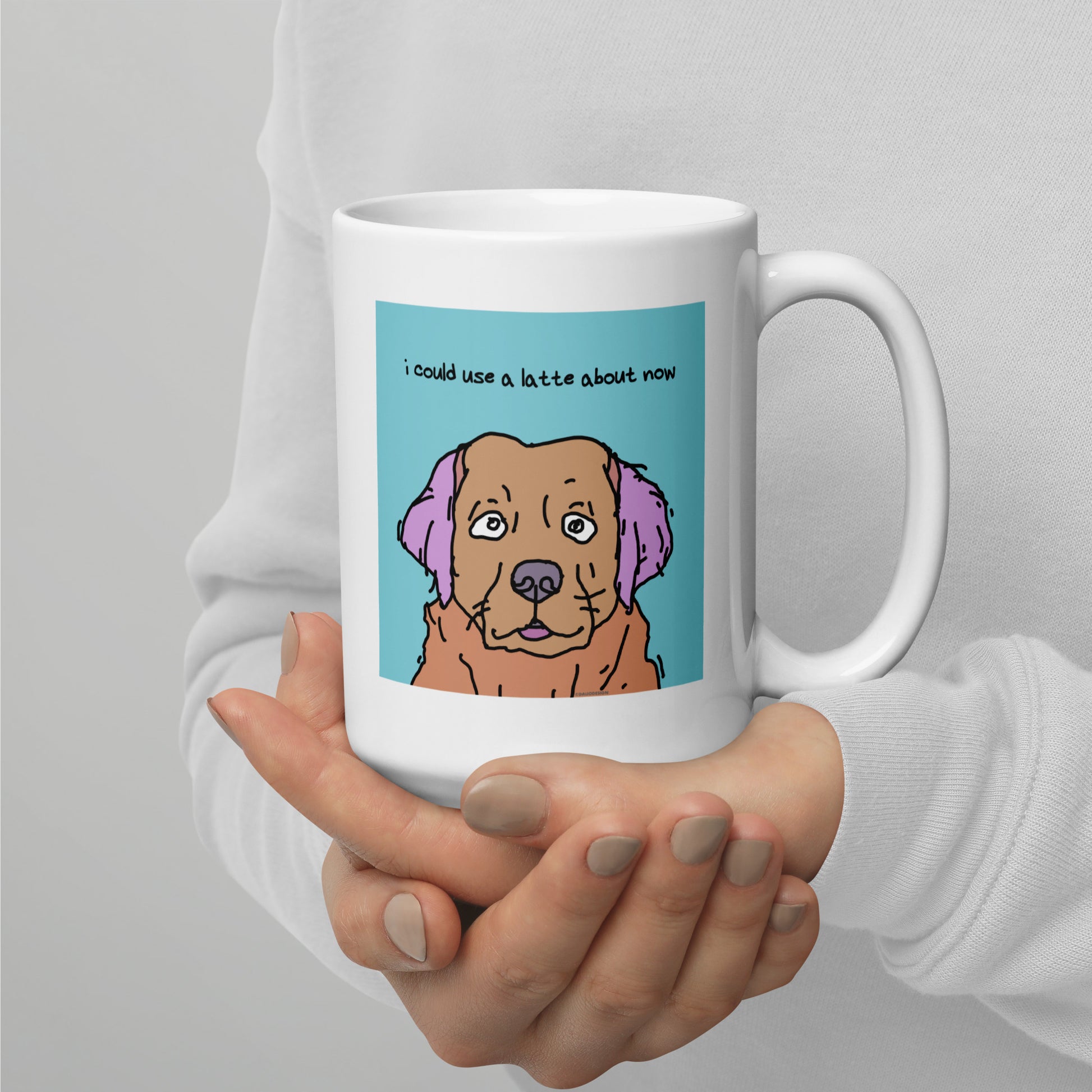 I could use a latte about now - 15 oz White glossy mug - designs on each side
