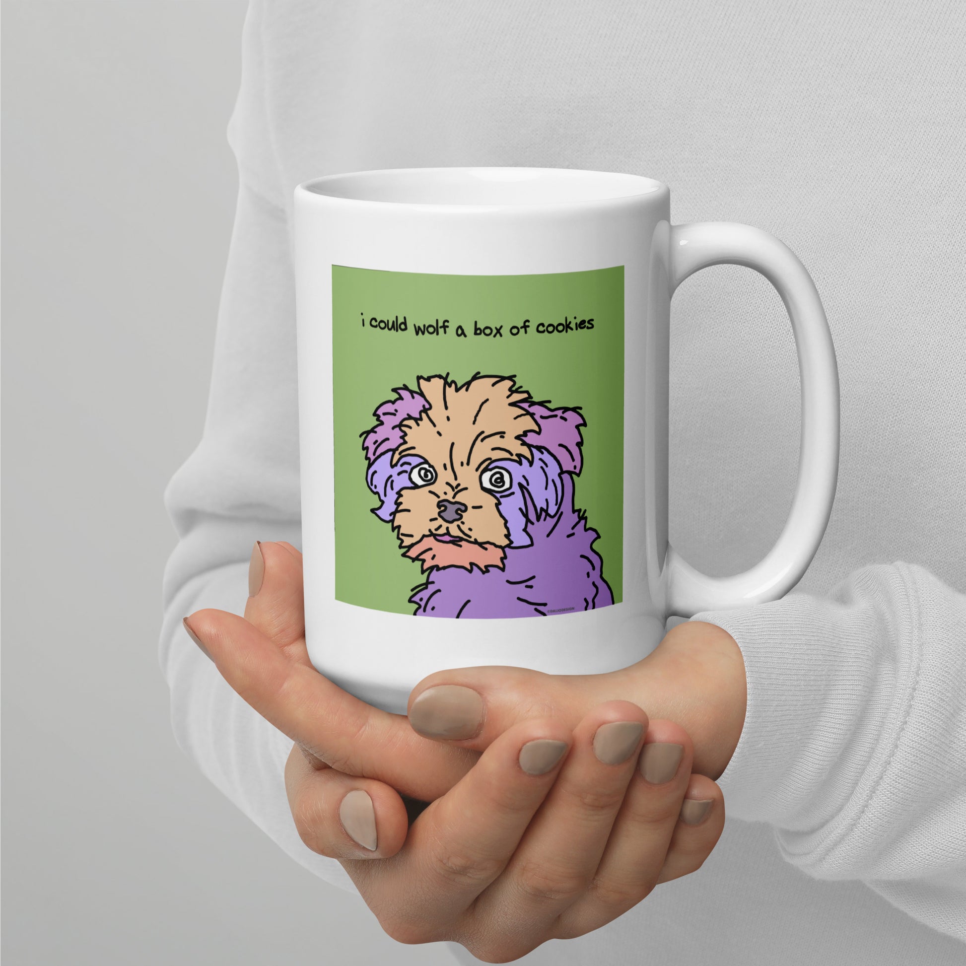 I could wolf a box of cookies - 15 oz White glossy mug - designs on both sides